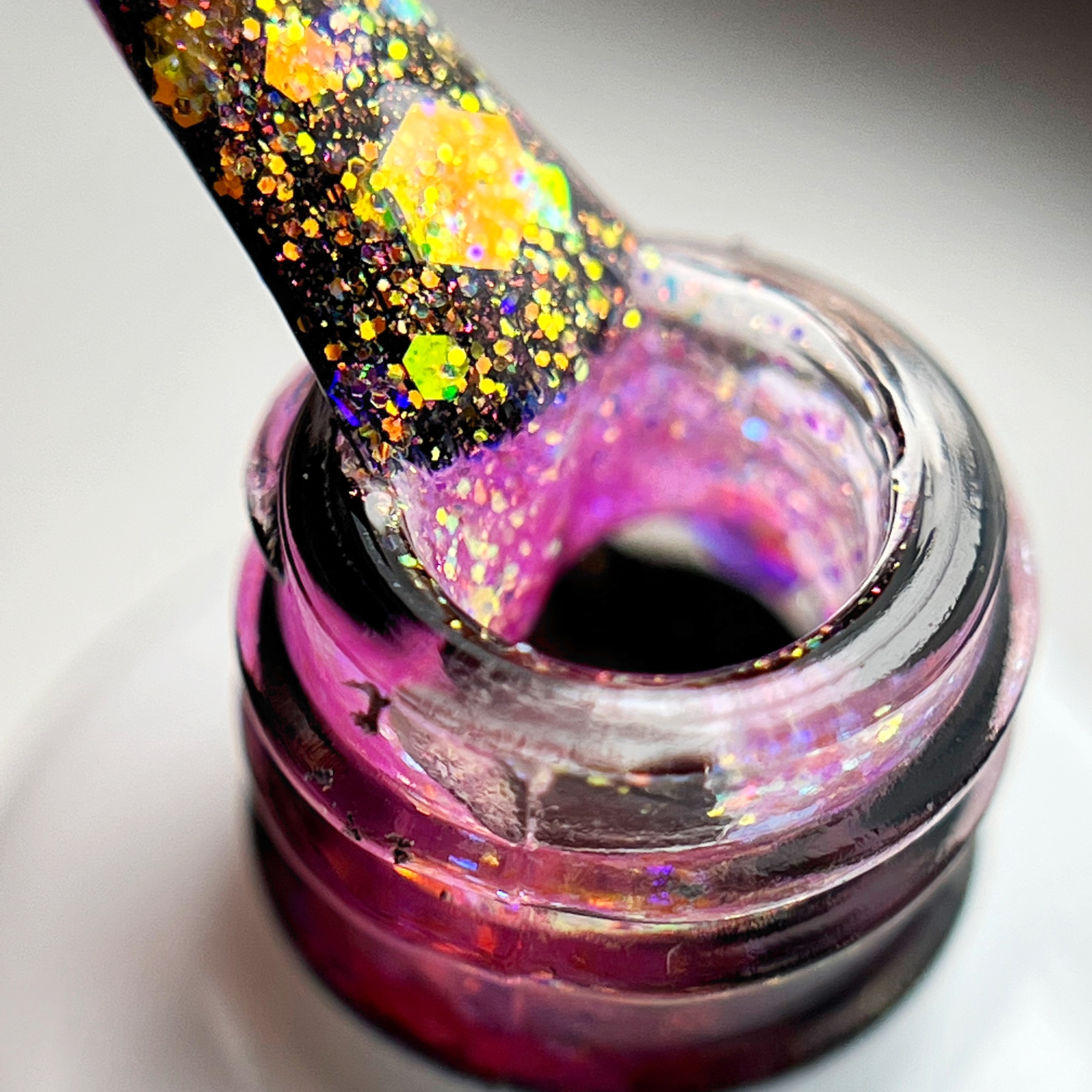 Lady – zawiera drobne błyszczące elementy oraz grubsze w formie plastra miodu, wszystko zanurzone w chłodnej różowej mgiełce.